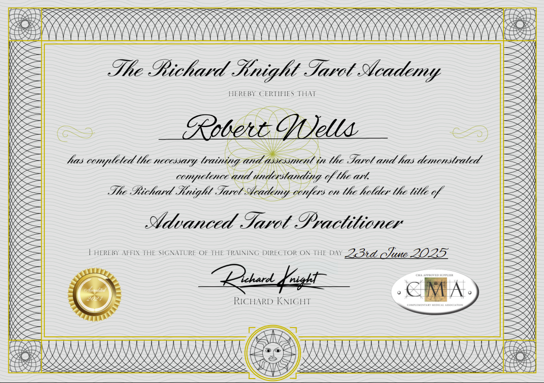 On that note you will be able to see on both sides of this section there is my accreditation certificate and my background in the professional mentorship I have had the pleasure of having and working with this enjoyable craft called tarot.